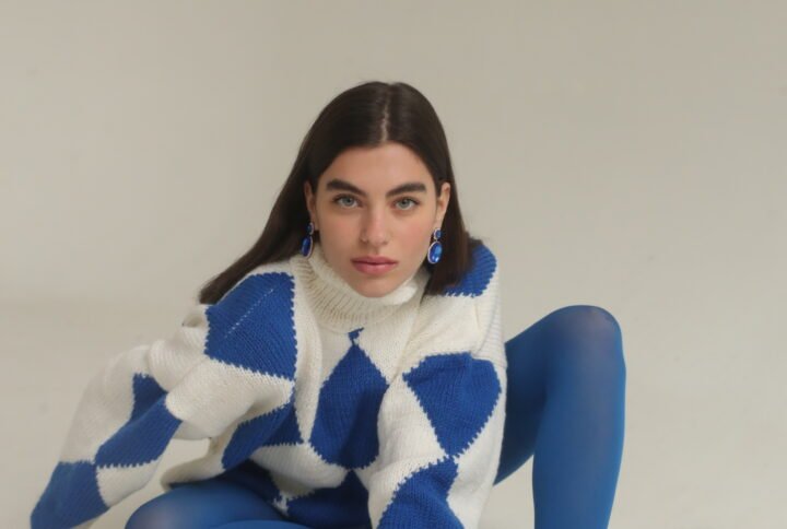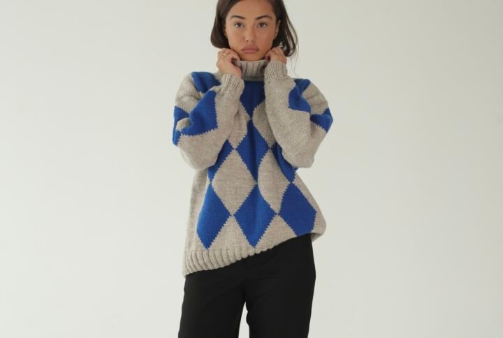 ხელით ნაქსოვი სვიტრი წითელი რომბებით