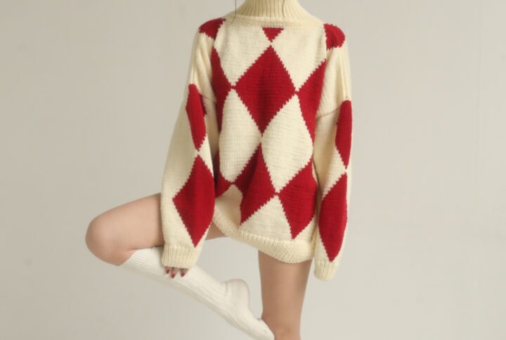 ხელით ნაქსოვი რომბებიანი ნაცრისფერი სვიტრი