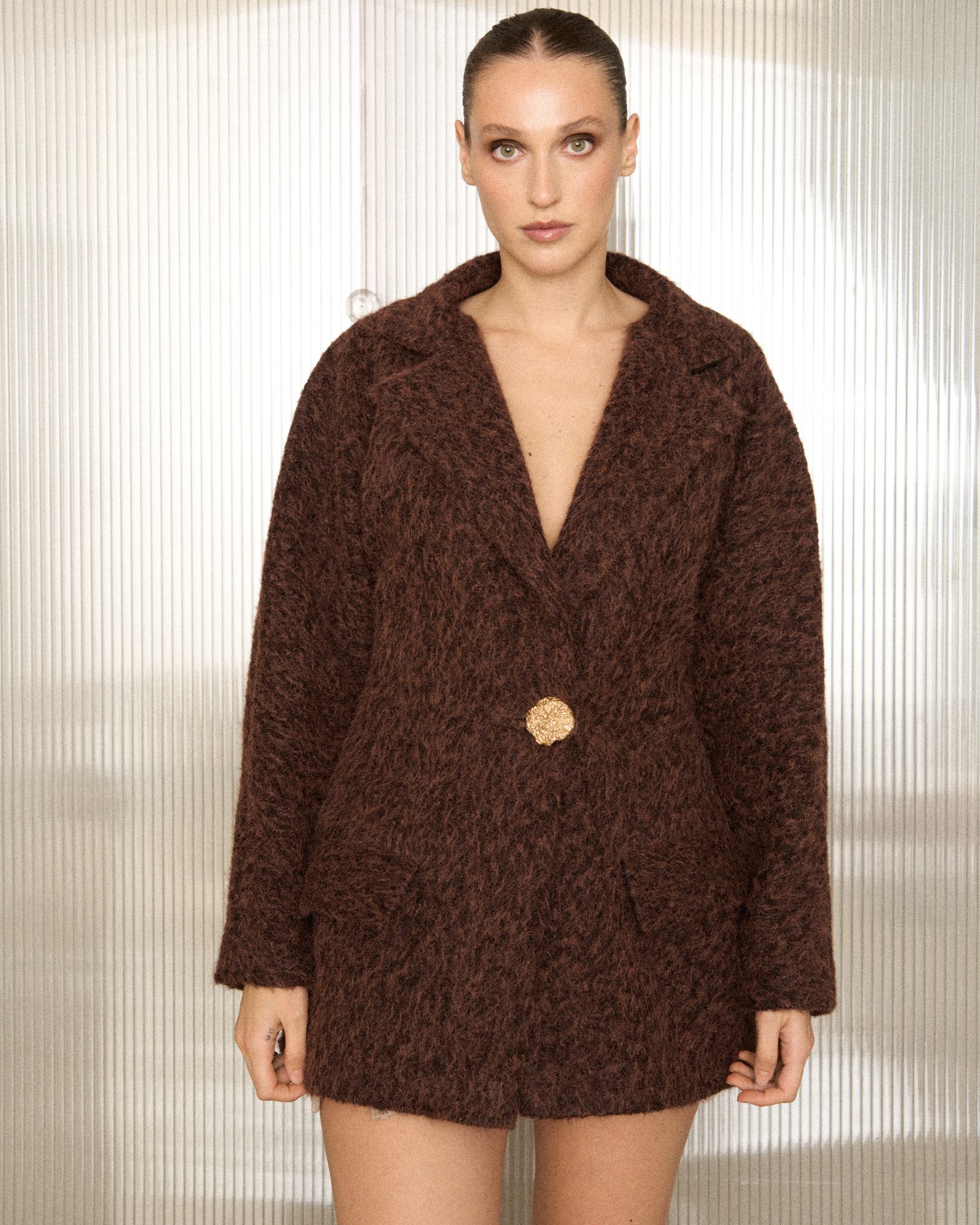 Elevate your outerwear game with this sculpted mohair blazer—a perfect blend of structure and softness. Featuring a rich, textured finish and a cinched waist that flatters the figure, this blazer creates a refined hourglass silhouette.