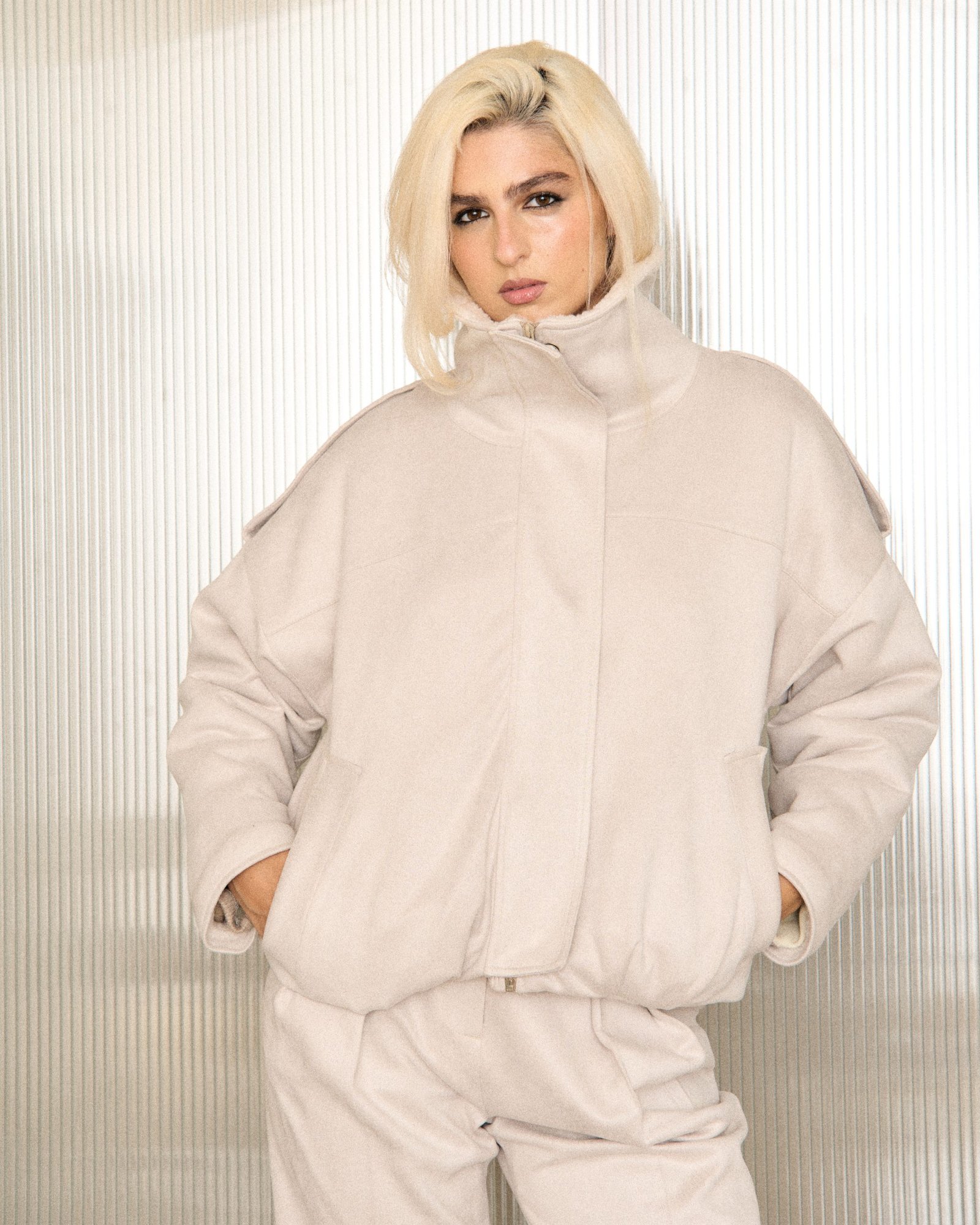 Soft on the outside, warm on the inside. The high funnel neck, dropped shoulders, and relaxed silhouette offer a sculptural yet effortless look. Finished with subtle utility-inspired details and side pockets, it’s perfect for elevated everyday layering.