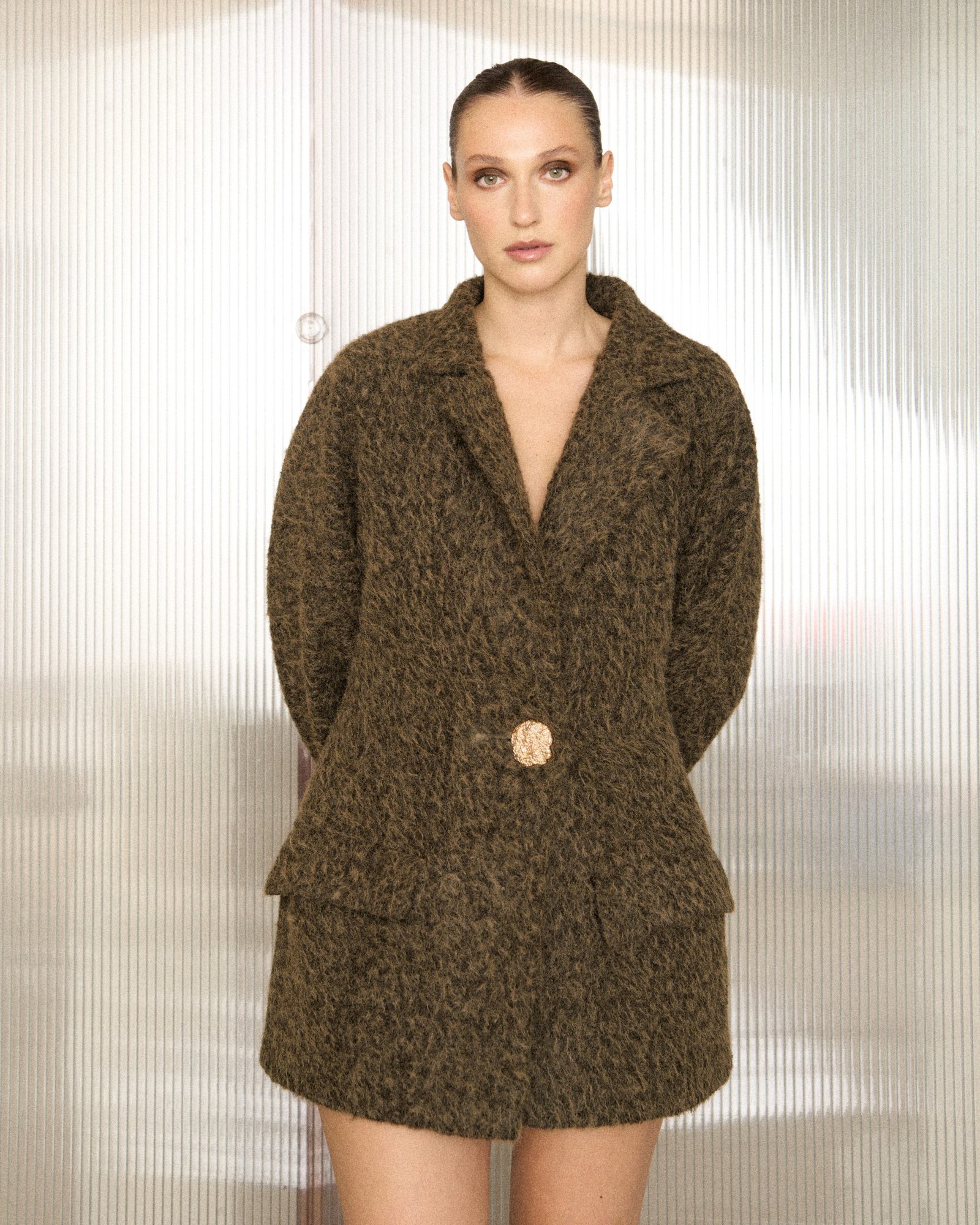 Elevate your outerwear game with this sculpted mohair blazer—a perfect blend of structure and softness. Featuring a rich, textured finish and a cinched waist that flatters the figure, this blazer creates a refined hourglass silhouette.