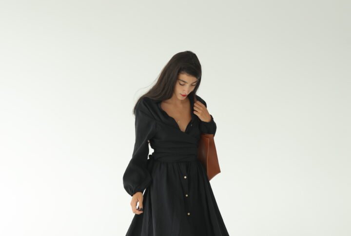 წითელი კოტონ-აბრეშუმის ქამრიანი კაბა