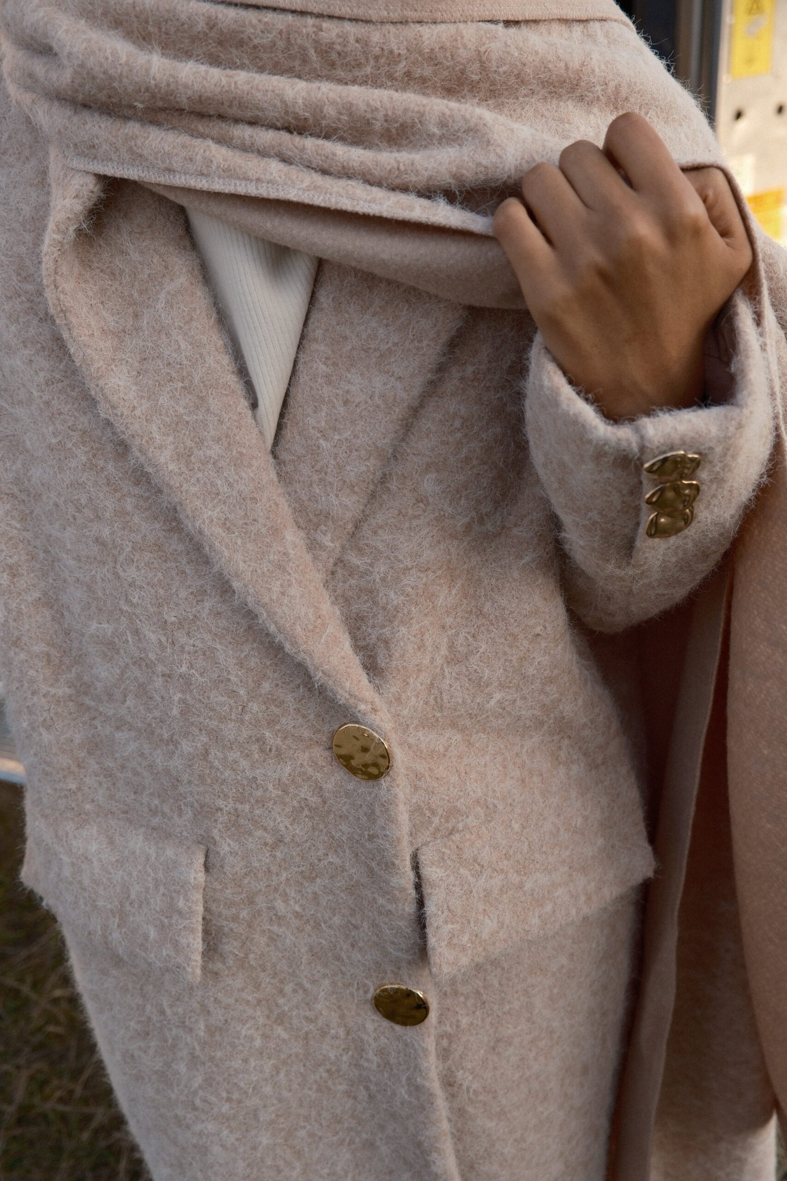 Beige wool coat with golden details